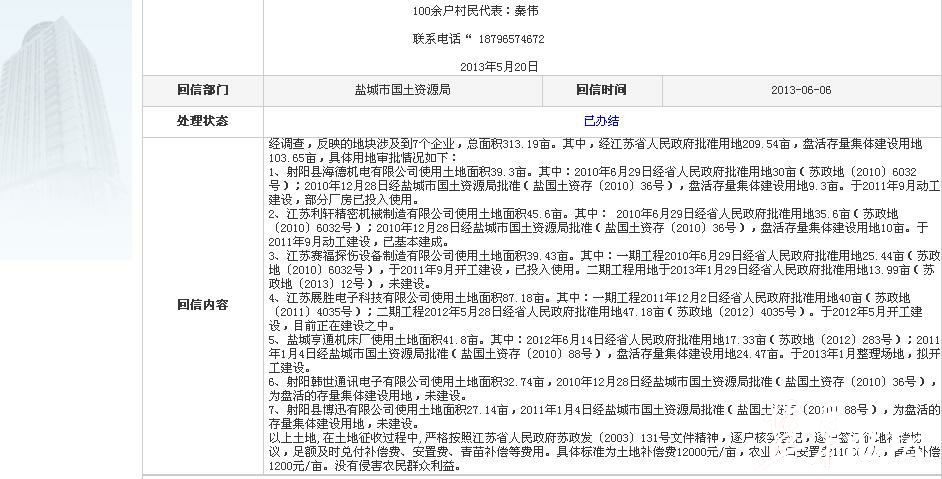 记者通过网络查询获知:关于“博讯光电”用地手续问题,2013年6月6日盐城市网络发言人平台显示:射阳县博迅有限公司使用土地面积27.14亩,2011年1月4日经盐城市国土资源局批准(盐国土资存〔2010〕88号),为盘活的存量集体建设用地,未建设。