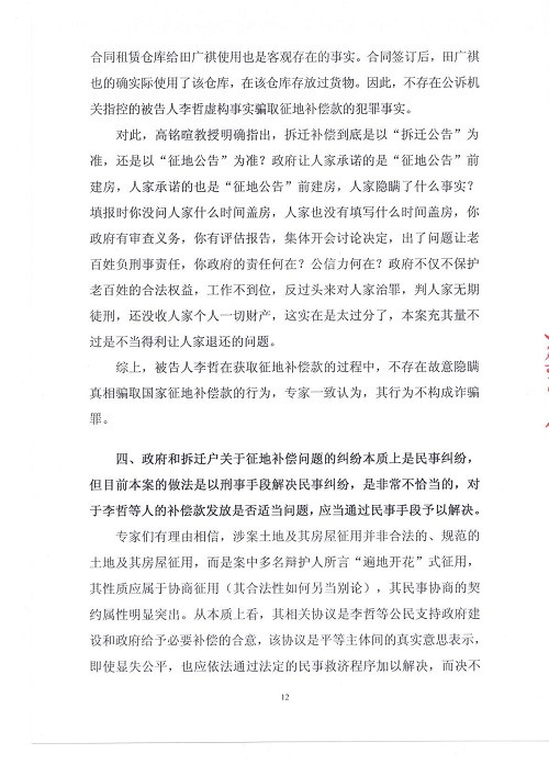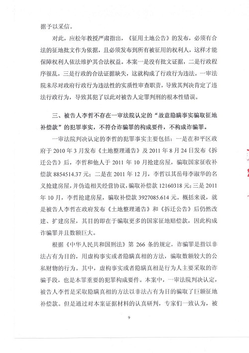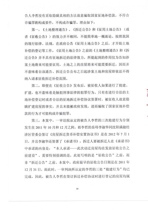 李哲也并没有“故意隐瞒事实骗取征地补偿款的事实”,报请补偿款的材料都是按照政府要求如实填写的,没有任何虚假的材料;政府让承诺的是在《征收公告》前建房,事实也是在《征收公告》前盖的房,这一事实当地老百姓和政府都是完全知道的,不存在隐瞒虚假问题。