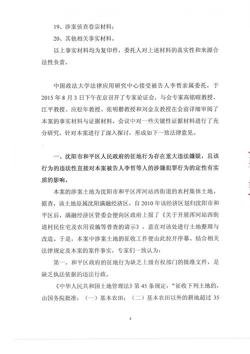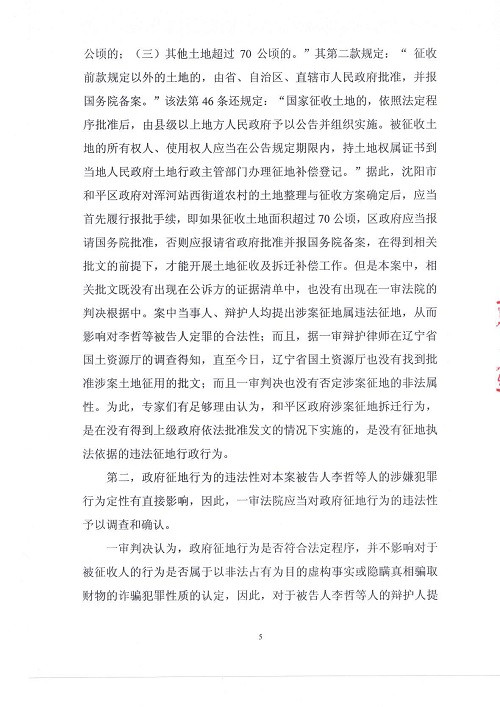 沈阳市和平区人民政府征地行为没有取得国务院或省级人民政府对农村土地征用的批示,是非法征用土地,沈阳市中级人民法院按照合法征用土地来对李哲等人定罪,是非法、无效的。