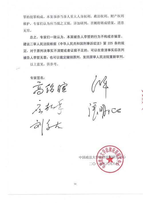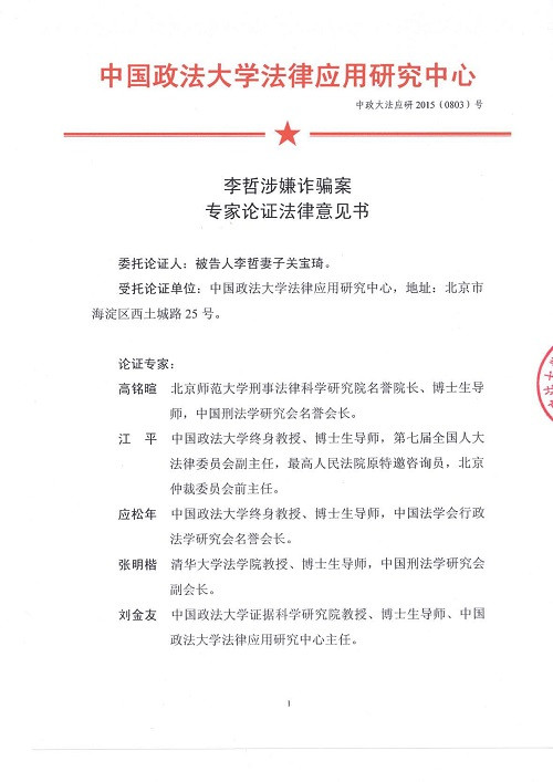 附:中国政法大学法律应用研究中心“李哲涉嫌诈骗案”专家论证法律意见书。