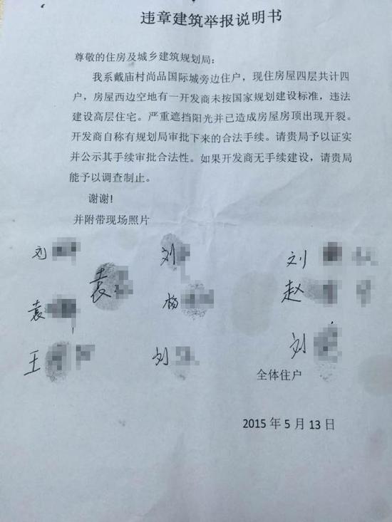 反映人还在举报中称,兆丰家园违建项目自动工以来,从来没有主动和附近居民住户协商,不仅强行施工,还请社会闲散人员在现场“维持秩序”。强行拆除反映人居住四层楼房楼下的储物棚,并没有做出任何解释及赔偿。为得到准建许可,还以承包工程为由欺骗二楼住户签订邻里关系协议书。二楼住户开始信以为真,于是多次请开发商吃饭,并得到开发商予以承包工程的承诺。但是,后来施工方在不予协商的情况下就私自动工开发,并采取种种欺骗、拖延的方式不予解决邻里纠纷。