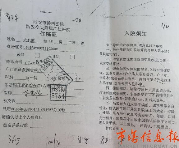 王女士告诉记者,小史的眼睛是在去年过年时发现的。当时在西安打工的她,回到家后,听奶奶说孩子右眼看不清,这可急坏了王女士。经过多方打听,王女士得知西安市第四医院的眼科享誉全国。为了不影响儿子的学习时间,王女士决定暑假带儿子去西安市第四医院就医。
