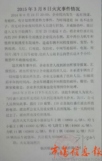 现今,“3年了,之前报的案子没破,这几年把我折腾的倾家荡产”2014年企业被逼无奈撤离后,今年3月8日,存放在原企业场地的商品车被纵火,16辆商品车被烧毁,9月21日,企业老总刘兰欣向记者反映,再次报案至今仍未有结果。
