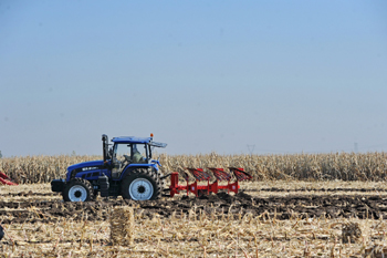 10月14日,一台土地深松机在吉林省榆树市环城乡万龙村的田间作业。 张楠/摄