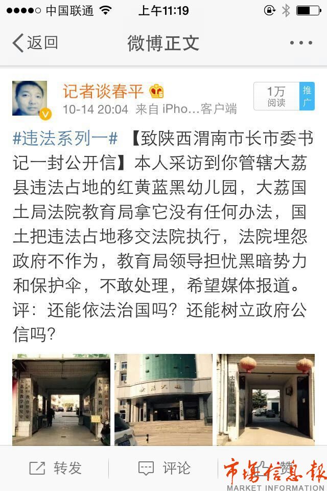 市场信息报【记者 谈春平】陕西大荔县西长社区的红黄蓝幼儿园,既是违法建筑,又没有相关的办园审批手续,却堂而皇之的招生营业。记者在当地采访得知,被大荔县国土局定性为违法建筑的红黄蓝幼儿园已移交大荔县人民法院强制执行近一年,该园却依然完好无损,采访中大荔各职能部门对此违法幼儿园都在采取回避和感叹无能为力,幼儿园长举报教育局长有违法行为有顾虑。
