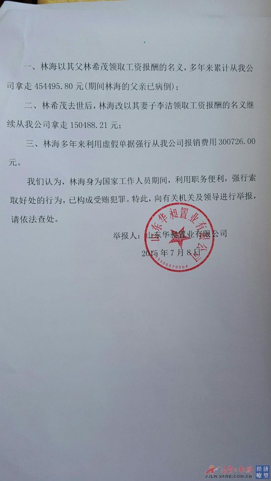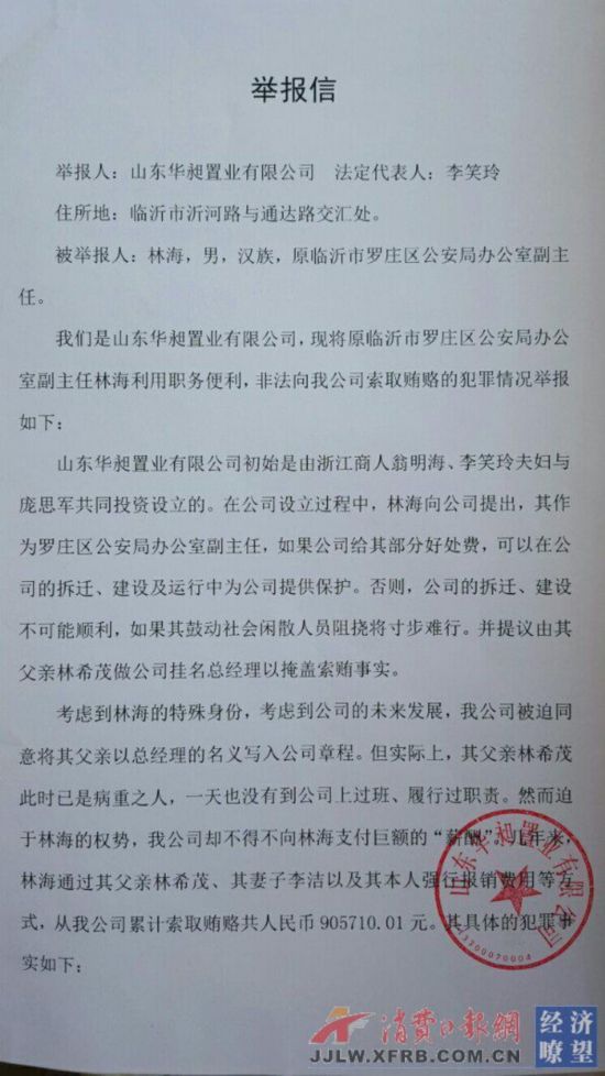 近日,记者接到山东华昶置业有限公司法人李笑玲、董事长翁明海的实名举报,材料中反映临沂市罗庄区原公安局办公室副主任林海(现已被停职)在职期间,自称能为公司在当地提供“保护”和“帮助”,并以各种名义前后向公司索取人民币近百万元。经过他们多次举报,林海终被“停职”。但“停职”后依旧安然无事,自称市里有关系,谁也奈何不了他。该举报材料也被多次递交到临沂市检察部门。
