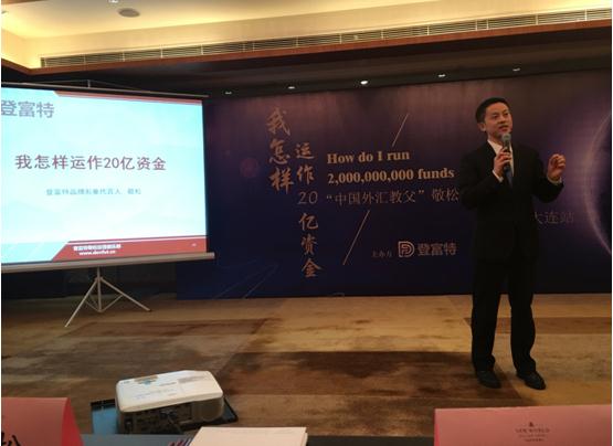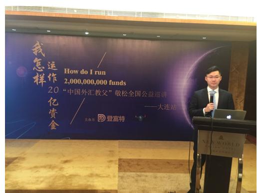 2015年11月1日,“我怎样运作20亿资金”全国公益巡讲活动来到了“浪漫之都”——大连。“中国外汇教父”敬松老师携高徒朱晓炜老师一同来到大连,分享他们的交易经历。本次讲座由登富特中国区品牌运营中心、登富特敬松投资俱乐部主办。大连是我国著名的海滨城市,多次被评选为“国家园林城市”,景色宜人。大连观众的热情让我们倍感亲切。现场的200多位观众都积极热情的参与到活动当中;活动现场座无虚席,多位观众特意从辽宁省其他城市赶来参加本次活动。