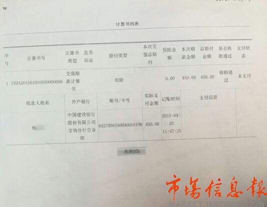 为了一探究竟,杨先生在西安就近的中国人保车险服务点查询了自己爱车的相关信息,信息显示“2015年2月22日在宝鸡出险,赔付金额450元,开户行建行宝鸡分行:账号622…196,5月30日结案”。至于案情的具体信息,杨先生被告知“由于事故发生地在宝鸡,人保宝鸡分公司具体受理”。