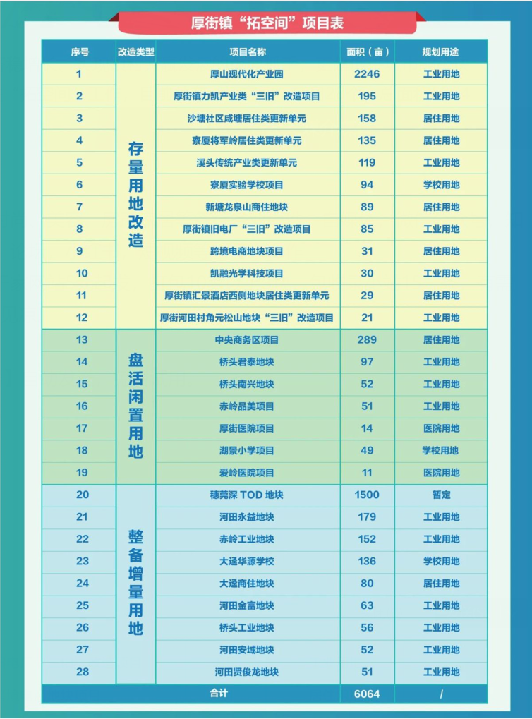 “拓空间”是厚街突破土地瓶颈、推动经济稳增长、实现镇村共赢发展的重要抓手,更是促进城市能级快速跃升的重要举措。近年来,厚街积极推进“拓空间”工作,目前共有“拓空间”项目28个,总面积6064亩。其中,通过存量用地改造项目12个,面积共3232亩;通过盘活闲置用地项目共7个,面积共563亩;通过整备增量用地项目9个,面积共2269亩。
