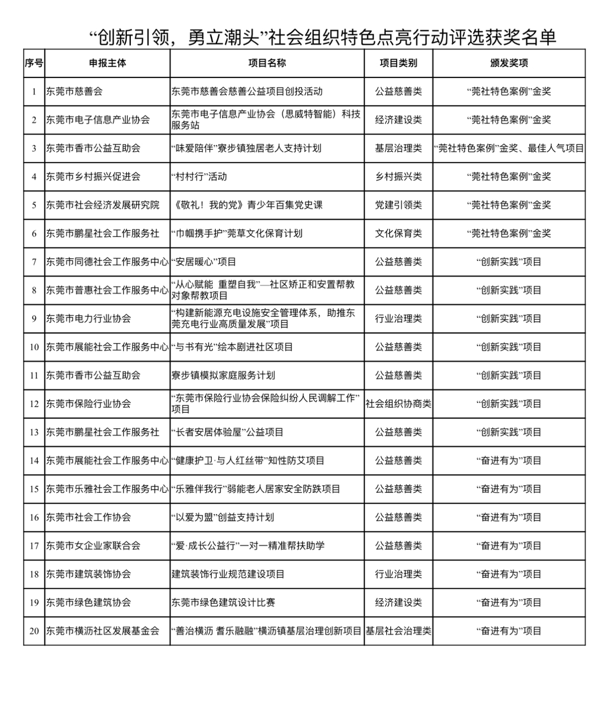12月8日,“创新引领,勇立潮头”莞社特色案例展示推广活动举行。活动揭晓了莞社特色案例金奖、“创新实践”项目奖、“奋进有为”项目等获奖项目名单,其中,体现党建引领、公益慈善、经济建设、基层社会治理、乡村振兴、文化保育的6个莞社特色案例项目获得金奖。