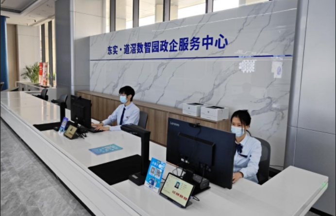 据了解,东实·道滘数智园智慧政务服务点选址道滘镇东实·道滘数智园项目展厅内,占地280㎡,设有窗口服务、自助服务、休息等候、前台等4个功能区,共设2个综合服务窗口,铺设1台“莞家政务”便民自助终端,能为企业群众提供便捷高效的政务服务。