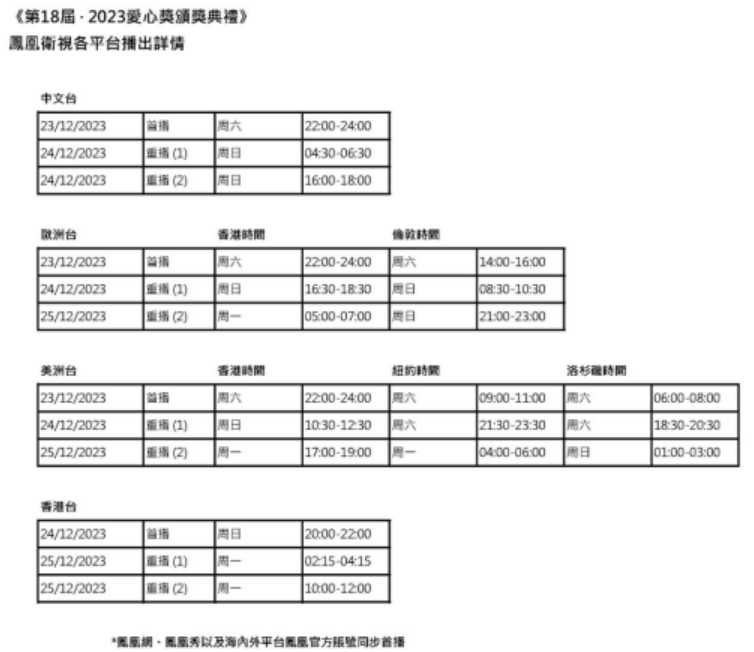 由港澳台湾慈善基金会爱心奖主办,凤凰卫视协办及制作、东西方慈善论坛、陈守仁基金会、许晓晖纪念基金、台湾吴修齐、吴俊杰公益基金会、现代财经基金会协办的第18届‧2023爱心奖颁奖典礼,12月9日(星期六)下午4时在香港凤凰卫视大埔总部举行。典礼的录影实况将于12月23日(星期六)晚10时于凤凰卫视中文台、欧洲台、美洲台、凤凰网、凤凰秀首播,12月24日(星期日)晚在香港台播出。