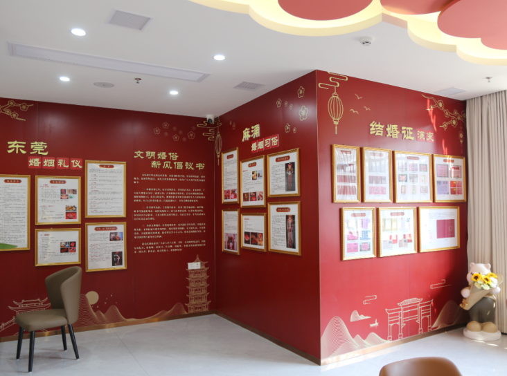 迁址揭牌的麻涌镇人民政府婚姻登记处位于古梅北路元创坊,建筑面积约930平方米,设有颁证厅、中西式留影区、候登区和婚姻家庭辅导室等,户外还设置多个爱情主题造景,接待咨询、休息等候、办证颁证、摄影打卡等各类场室和设施一应俱全。同时优化登记流程、升级家庭辅导、法律咨询等服务,打造一个有“爱”有“温度”的“公园式婚姻登记窗口”,让群众在温馨浪漫、庄重严肃的氛围和仪式中,感悟幸福真谛,提升了麻涌婚姻登记的服务水平。