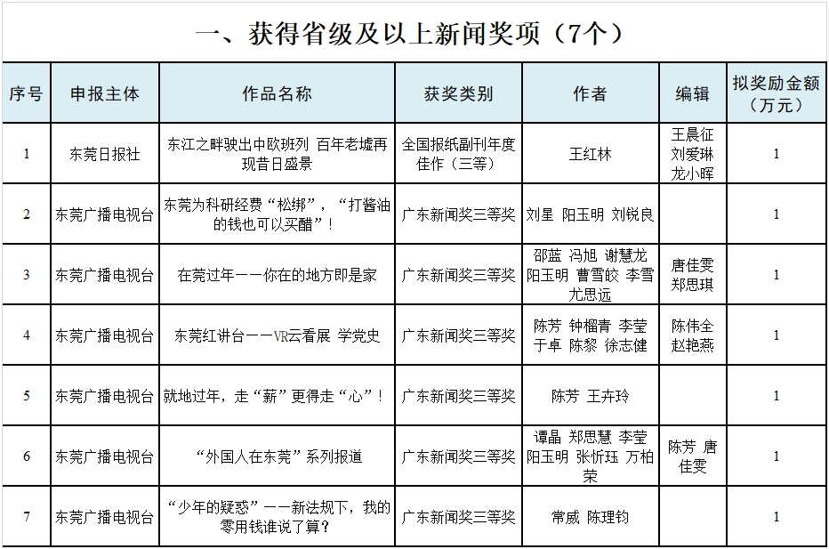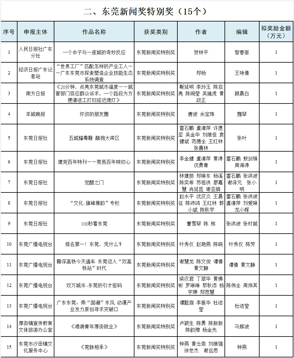 根据《东莞市文化发展专项资金管理暂行办法》(东府办〔2022〕28号),市委宣传部近期组织开展了2023年东莞市文化发展专项资金(新闻报道类)评审工作。根据专家评审结果,拟对22个项目进行奖励。其中,获得省级及以上新闻奖项的项目7个、东莞新闻奖特别奖的项目15个。