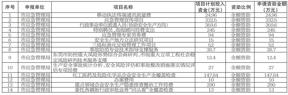 根据《东莞市安全生产专项资金管理办法》的规定,市应急管理局组织申报了2024年东莞市安全生产专项资金项目,经审核,符合资助条件的项目有14个,需安排资金合计1662万元。现对资金项目安排计划公示如下: