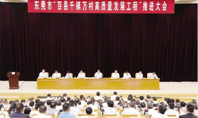 2023年5月6日,东莞召开市委农村工作会议暨全面推进“百县千镇万村高质量发展工程”构建更高水平城乡融合发展格局动员大会,全面贯彻落实党的二十大精神,深入贯彻习近平总书记视察广东重要讲话、重要指示精神,认真落实省委省政府部署要求,动员全市各级把握重大历史机遇,坚持三级书记抓乡村振兴、举全市之力实施“百千万工程”。聚焦“抓什么”“怎么抓”“谁来抓”进行深入阐述,提出打造一批千亿镇、百亿村,实现全市镇村实力的整体提升,以新担当新作为书写中国式现代化东莞新篇章。