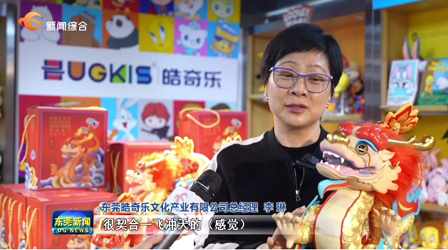 东莞皓奇乐文化产业有限公司总经理李琳:“可以说是巧夺天工,这个龙很有特色,我做玩具那么长时间,这是塑胶和毛绒结合得完美的龙,很多龙都是横的,吉祥龙尾巴向上的,脸也是向上的,很契合一飞冲天的感觉,很有气势。”
