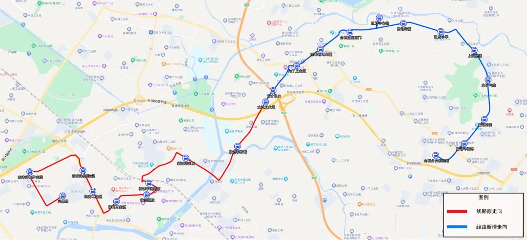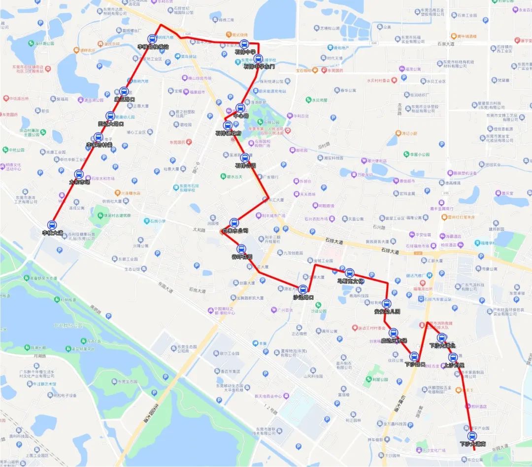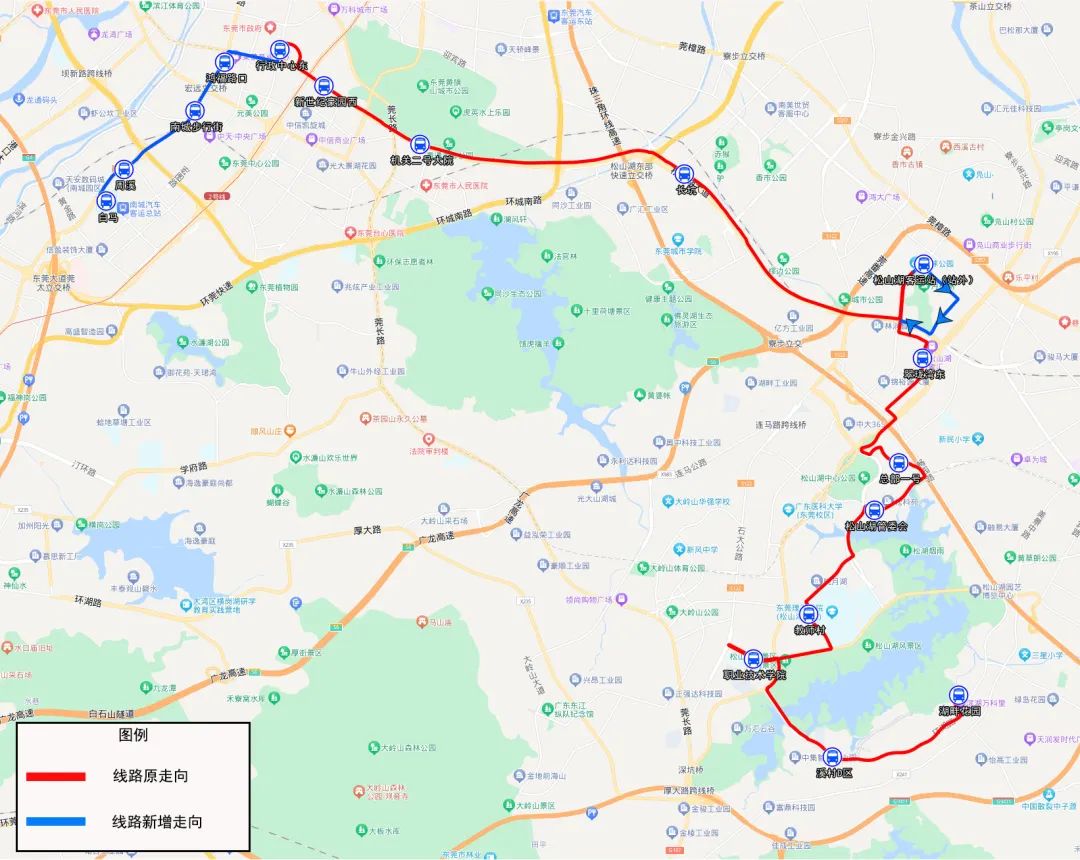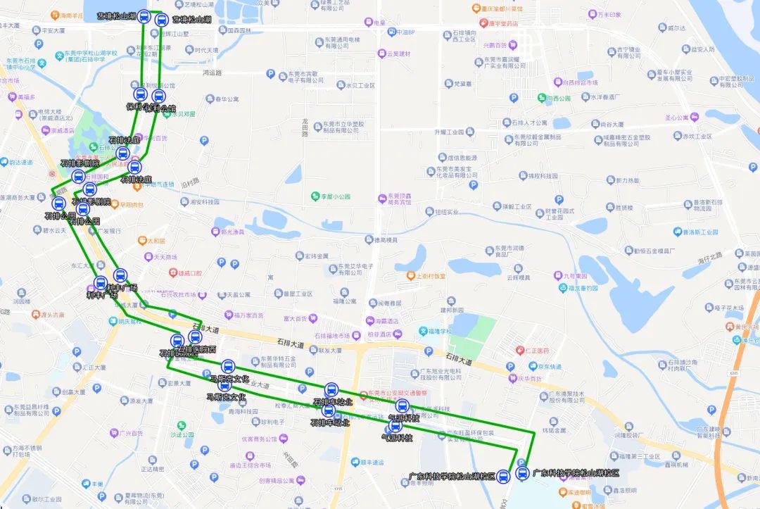 双方向新增:鸿福路口、南城步行街、周溪、白马、松山湖客运站(站外)、松涛公寓、新兴园