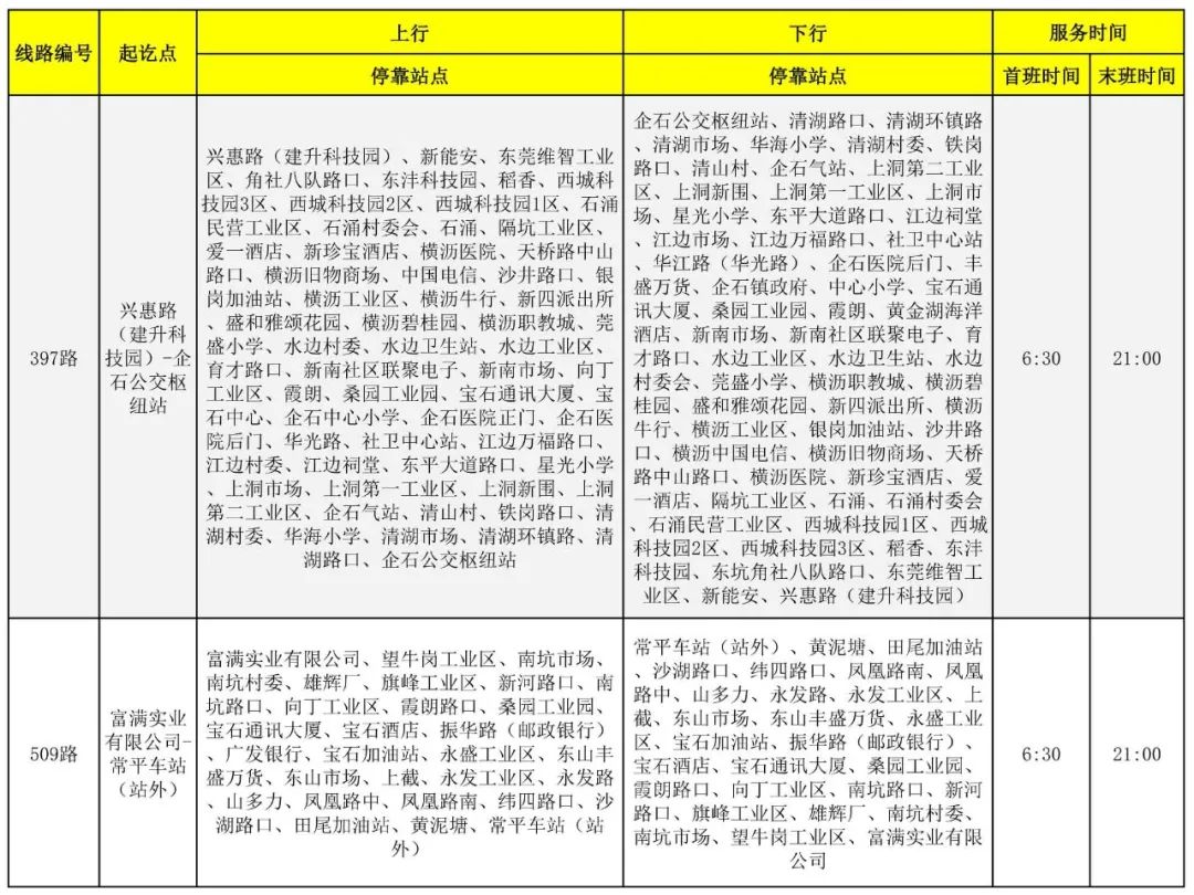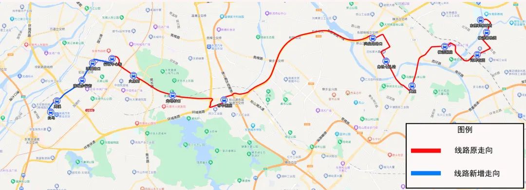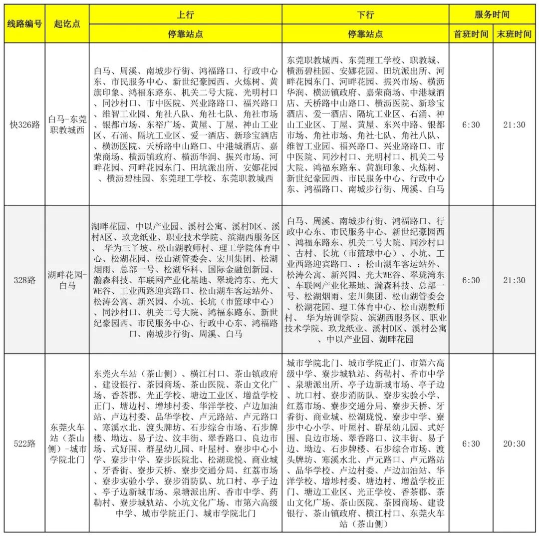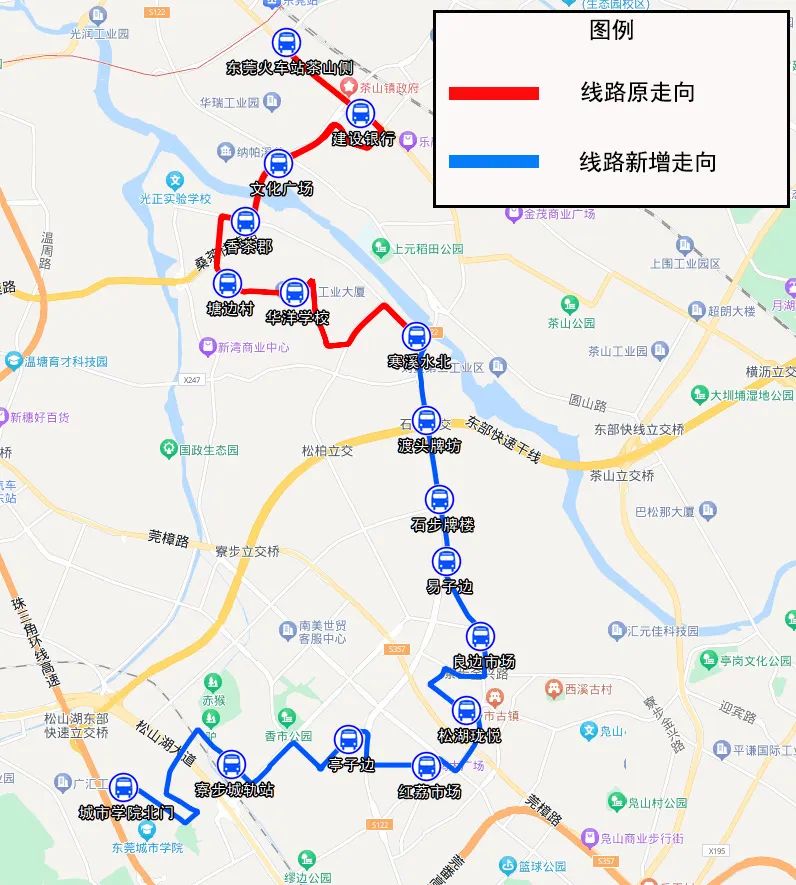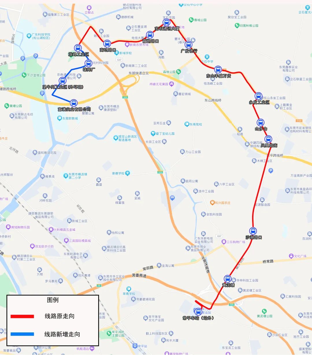 双方向新增:鸿福路口、南城步行街、周溪、白马、松山湖客运站(站外)、松涛公寓、新兴园