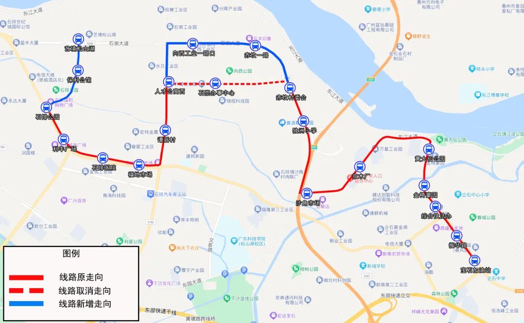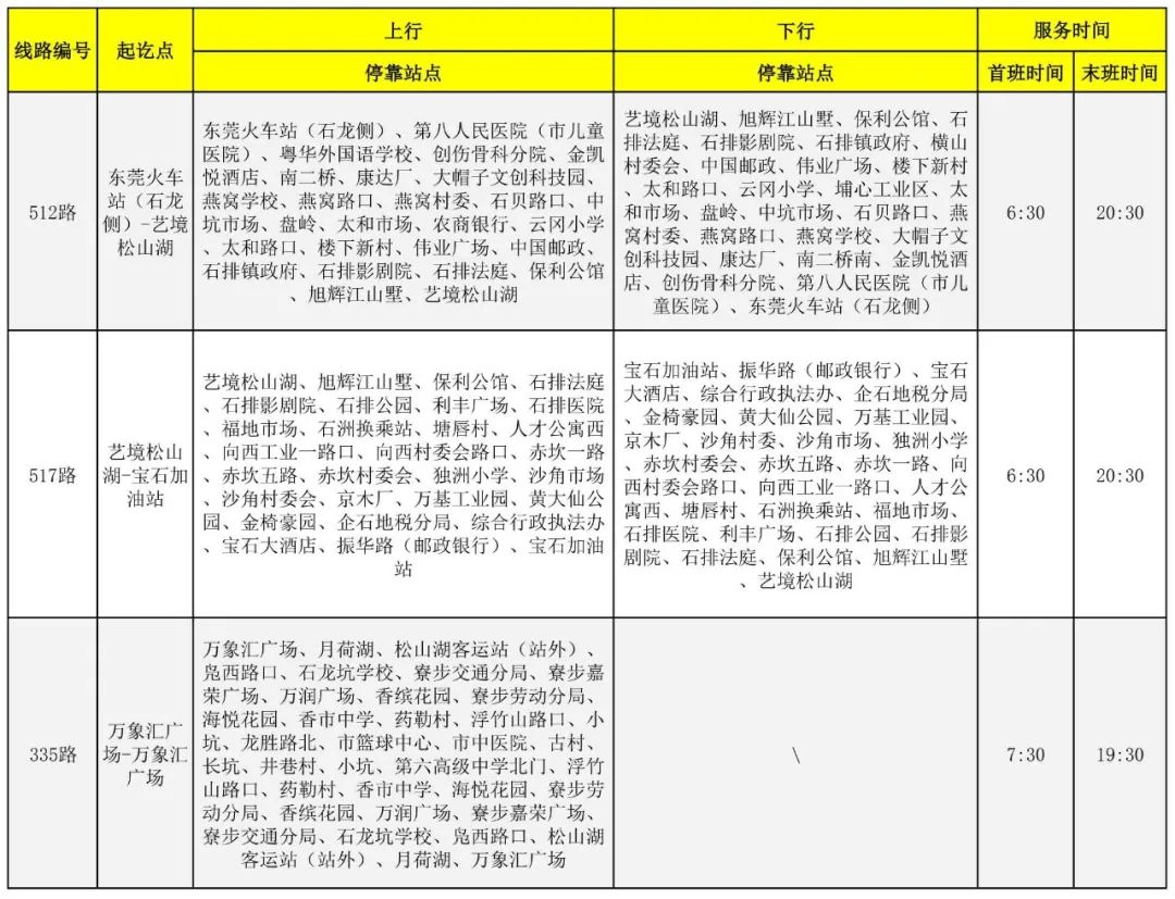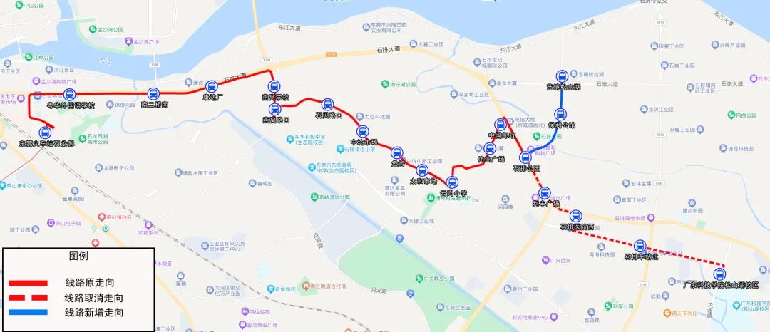 双方向取消:利丰广场、石排医院西、石排车站北、广东科技学院松山湖校区等站点