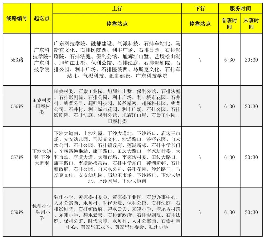 替代出行建议:原“利丰广场、石排医院西、石排车站北、广东科技学院松山湖校区”等站点上车的乘客,可换乘553路。