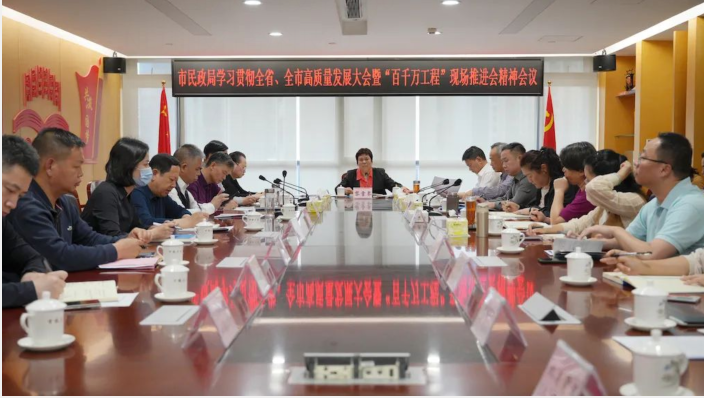 近日,东莞市民政局召开局党组(扩大)会议,专题学习贯彻全省高质量发展大会、全市高质量发展大会暨“百千万工程”现场推进会精神,围绕高质量发展主题,研究部署2024年工作任务。市民政局党组书记、局长黎雪琴主持会议并讲话,局领导班子成员结合职能分工进行研讨交流,局机关各科室和下属各单位负责人参加会议。