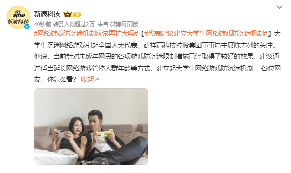 人大代表陈志列:建议建立大学生网络游戏防沉迷机制