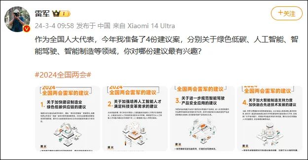 3月4日,小米创办人、董事长兼CEO@雷军 在社交平台上发文称,作为全国人大代表,今年我准备了4份建议案,分别关于绿色低碳、人工智能、智能驾驶、智能制造领域。