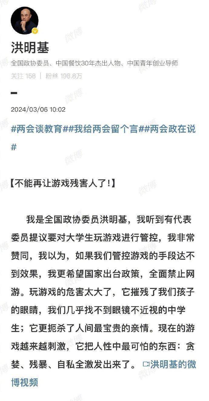 昨日,全国政协委员洪明基在接受未来网采访时表示,“不能再让游戏害人了”。除此之外,还要全面禁止18岁以下的未成年人玩网络游戏。