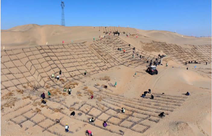在巴彦淖尔市磴口县境内的西部荒漠综合治理一期项目区,上百名工人正在利用稻草开展栽植沙障作业,一排排整齐的草方格向远处延伸,一个个沙丘被草方格牢牢锁住。磴口县防沙治沙局副局长韩应联说:“我们在流动沙丘区域制作草方格沙障,逐步改善沙漠生态、防治荒漠化。”