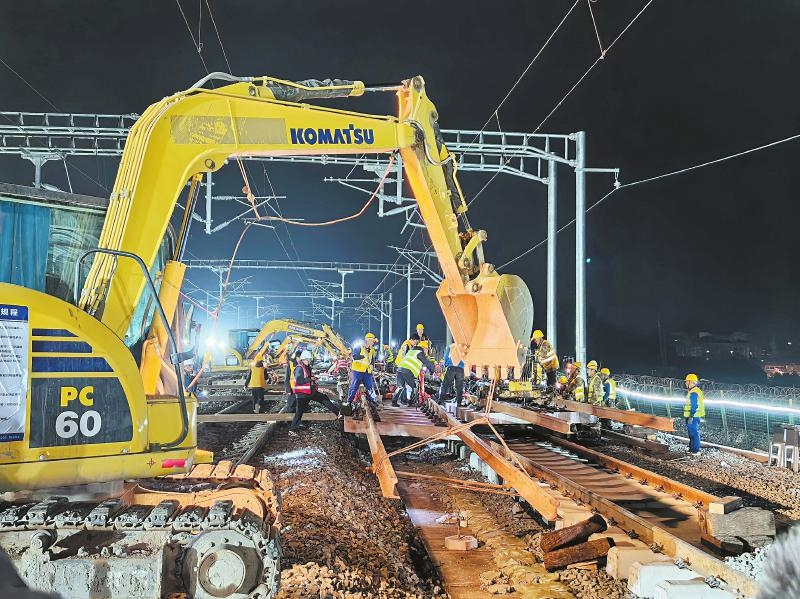 自3月10日首组道岔插铺封锁施工以来,现场300余名施工人员、8台施工机械同时作业,历经5个Ⅱ级天窗点封锁施工,顺利完成5组道岔的插铺施工,拆除旧钢轨340米、旧轨枕560余根,补充道砟400余立方米。至此,巴南高铁全线轨道工程全部完成。