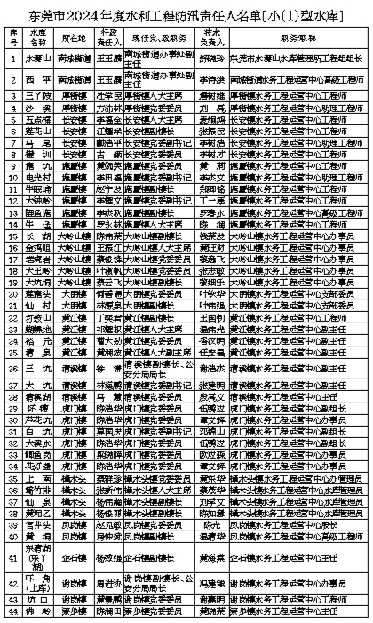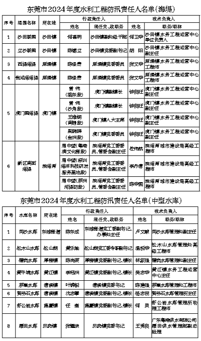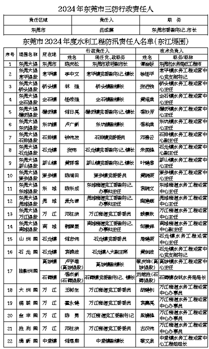 为进一步做好2024年全市三防工作,严格落实三防责任,保障人民群众生命财产安全,根据《中华人民共和国防洪法》《中华人民共和国防汛条例》《中华人民共和国抗旱条例》《广东省防汛防旱防风条例》有关规定,现将我市防汛抗旱防台风行政责任人和东江堤围、海堤、中型水库、小(1)型水库2024年度防汛责任人名单向社会公布。各级有关责任人要切实履行职责,认真做好三防各项工作,自觉接受社会的监督,市应急管理局值班电话:26261717。