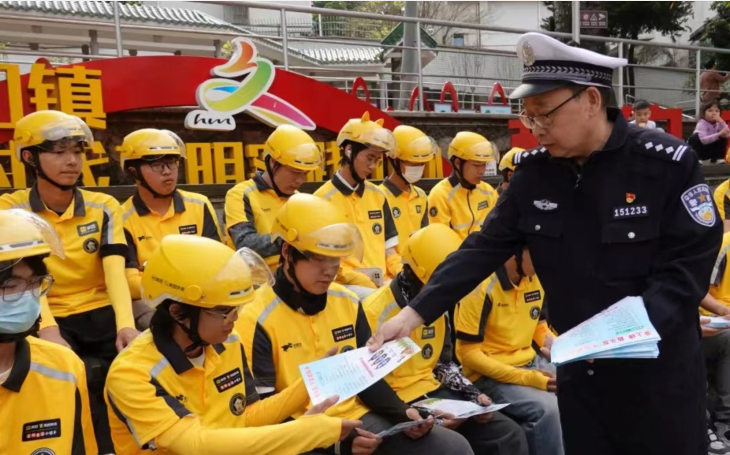 交警结合外卖行业的特点,针对外卖送餐员目前普遍存在的骑行电动自行车时不戴安全头盔、不走非机动车道、逆行、闯红灯以及边开车边讲电话等交通违法行为,分析其危险性及容易导致的事故后果,叮嘱其以后送餐时即使再赶时间也要遵守交通法规,为自己的安全负责,也为他人的安全负责。