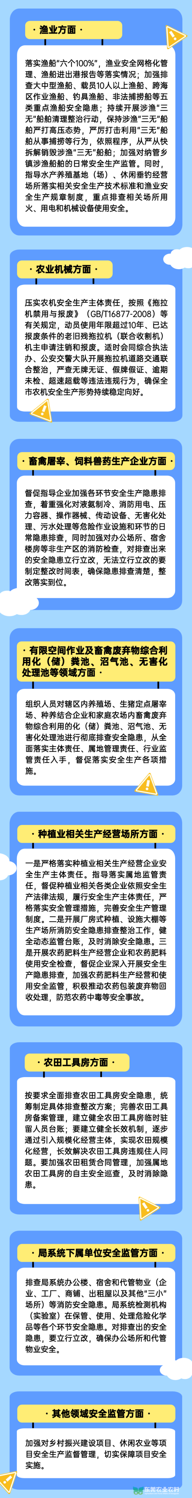 此次整治行动,由市农业农村局牵头,各下属单位和镇街农业部门配合。市镇两级共同发力,针对存在的薄弱环节和风险隐患,对易发生安全事故的重点区域、重点生产经营主体、重点环节进行检查,涵盖了渔业、农业机械、畜禽屠宰、兽药饲料、有限空间、种植业相关生产经营场所、农田工具房和代管物业等八个方面。