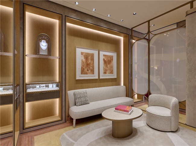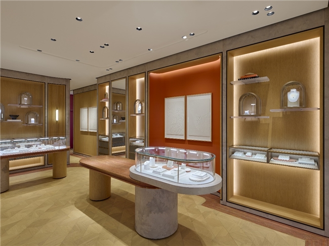 Joyce Wang表示:“我们以丰富的木材结合锈红色洞石和灰褐色皮革,塑造出一位品味策展人的优雅居停。传统的陈列架化作升高的玻璃柜,感觉明亮轻盈,使钻石珠宝作品犹如悬浮半空,成为焦点所在。”