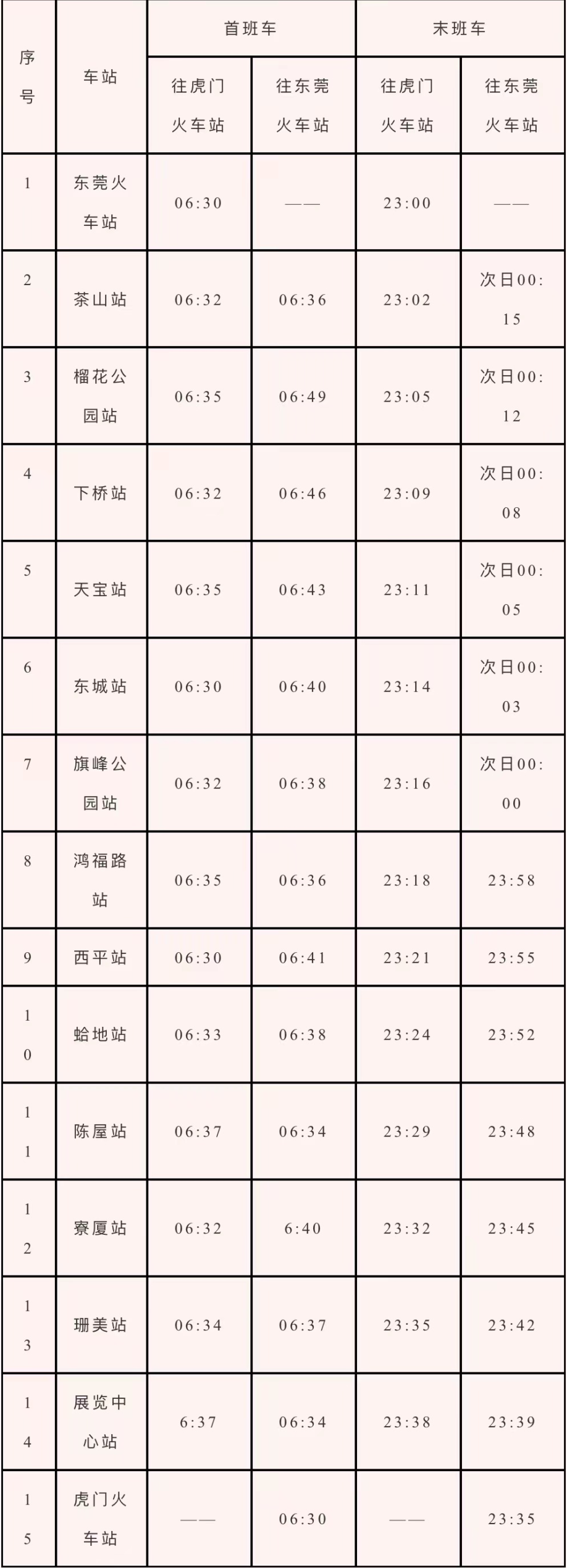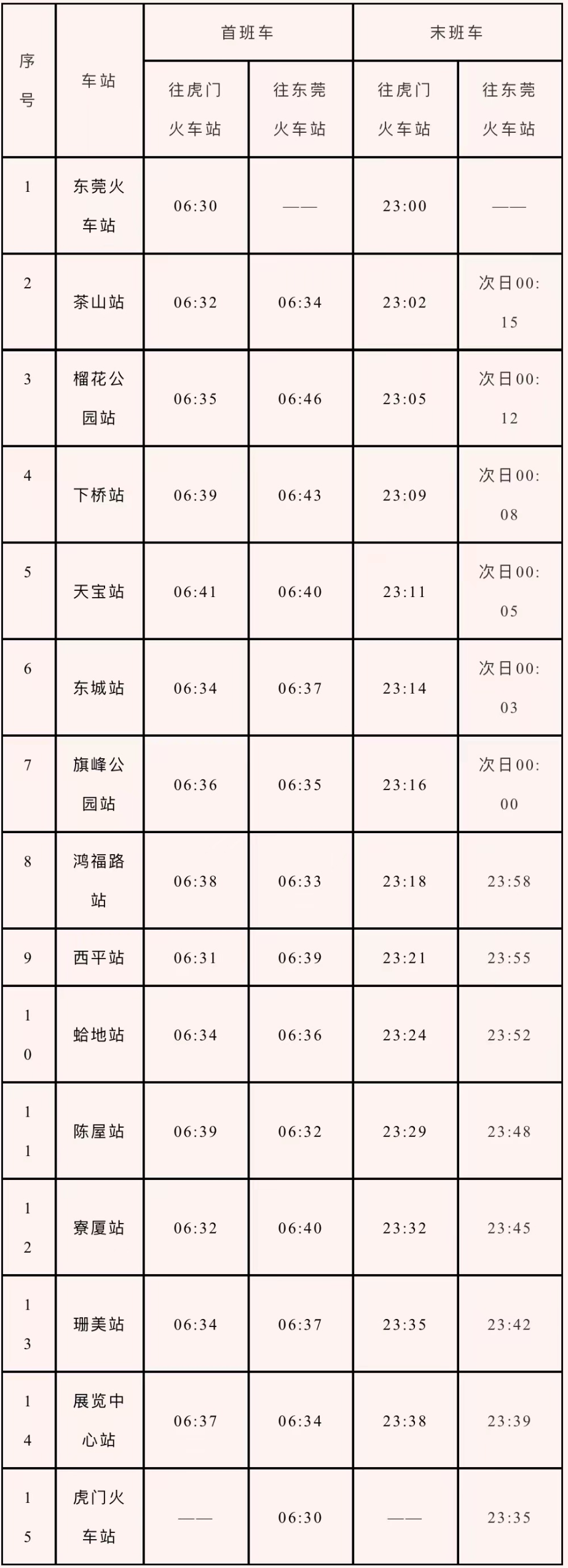东莞火车站末班车延长至23:00,虎门火车站末班车延长至23:35、