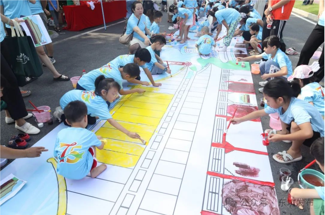 活动现场,一张由中华大地以及东莞市、东坑镇的文化古迹、地标建筑、特色景点绘制而成的祖国新貌百米长卷图,在地面上一字铺开,亲子们身穿统一活动服装,拿着颜料和刷子,分工合作,认真细致地为画卷“焕新”添彩。