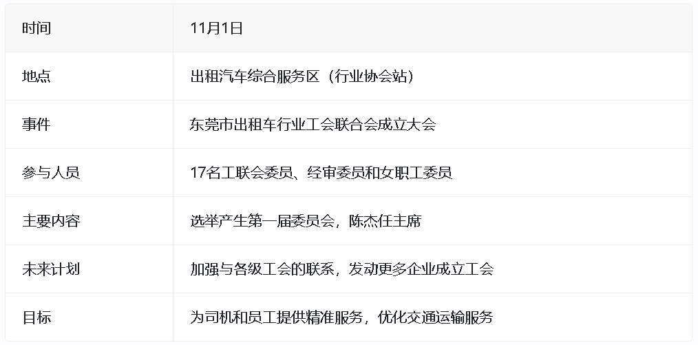 11月1日,东莞市出租车行业工会联合会成立大会暨第一届第一次会员代表大会在出租汽车综合服务区(行业协会站)举行,标志着东莞市出租车行业工会联合会的正式成立,为新业态发展注入了新的动力。在本次大会上,选举产生了17名工联会委员以及经审委员和女职工委员,陈杰当选为第一届委员会主席。