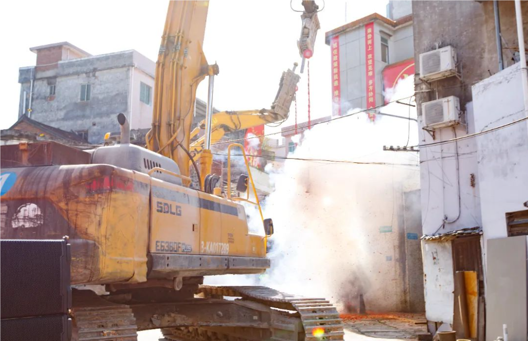 随着一声令下,挖掘机开始对首批34幢已移交房屋进行拆除,洒水车同步作业,抑制扬尘。现场秩序井然,展现了高效的组织和准备工作。此举不仅标志着圳头城中村改造项目的“首拆”成功,更意味着项目迈出了关键性的一步。