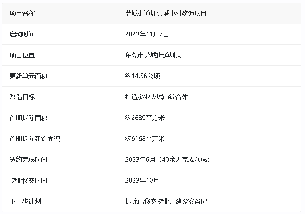 总结:东莞莞城圳头城中村改造项目的正式启动,是城市发展和更新的重要里程碑。在政府的高效组织和居民的积极配合下,项目正稳步推进,未来将打造成为一个现代化、宜居的综合社区,为东莞的城市品质提升和居民生活质量改善做出显著贡献。