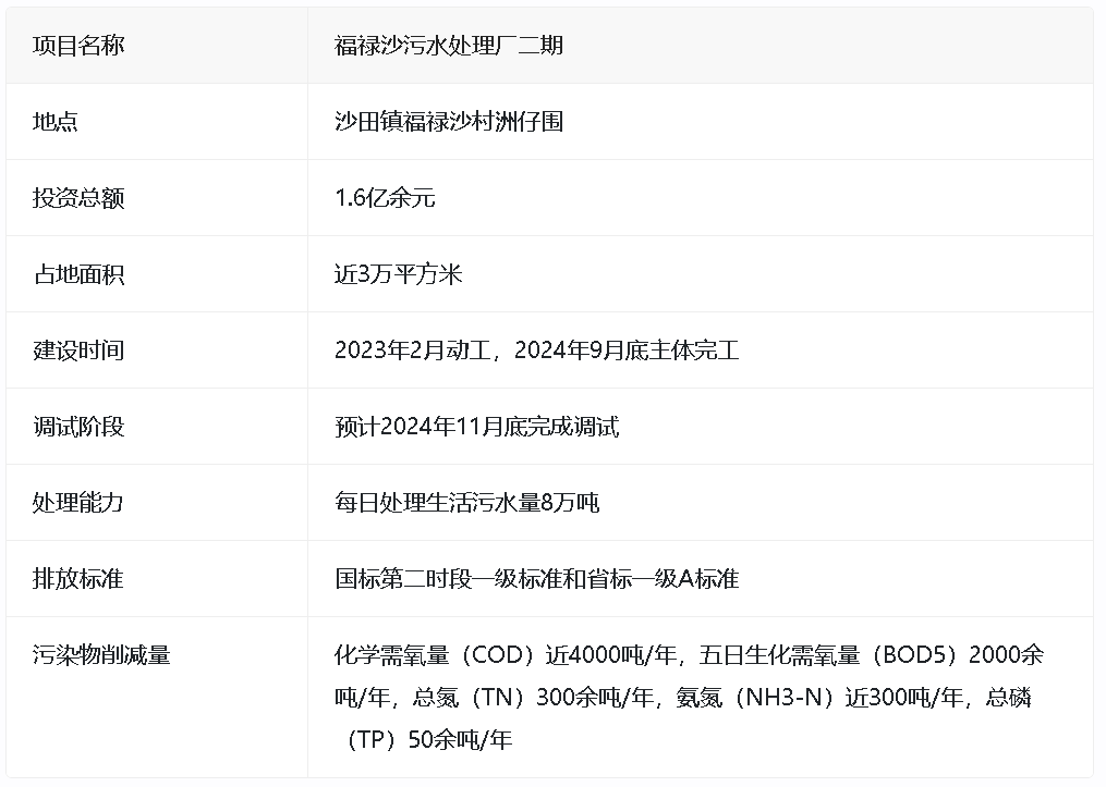 福禄沙污水处理厂二期位于沙田镇福禄沙村洲仔围,占地近3万平方米。厂区内建有细格栅及旋流沉砂池、多级AO生物反应池、矩形周进周出二沉池、高效沉淀池、反硝化滤池、纤维板框滤池、紫外消毒明渠、储泥池、污泥水干化车间等主要设施。该工程于2023年2月动工建设,2024年9月底主体处理设施完工后进入调试阶段,预计11月底完成调试并投入全面运行。