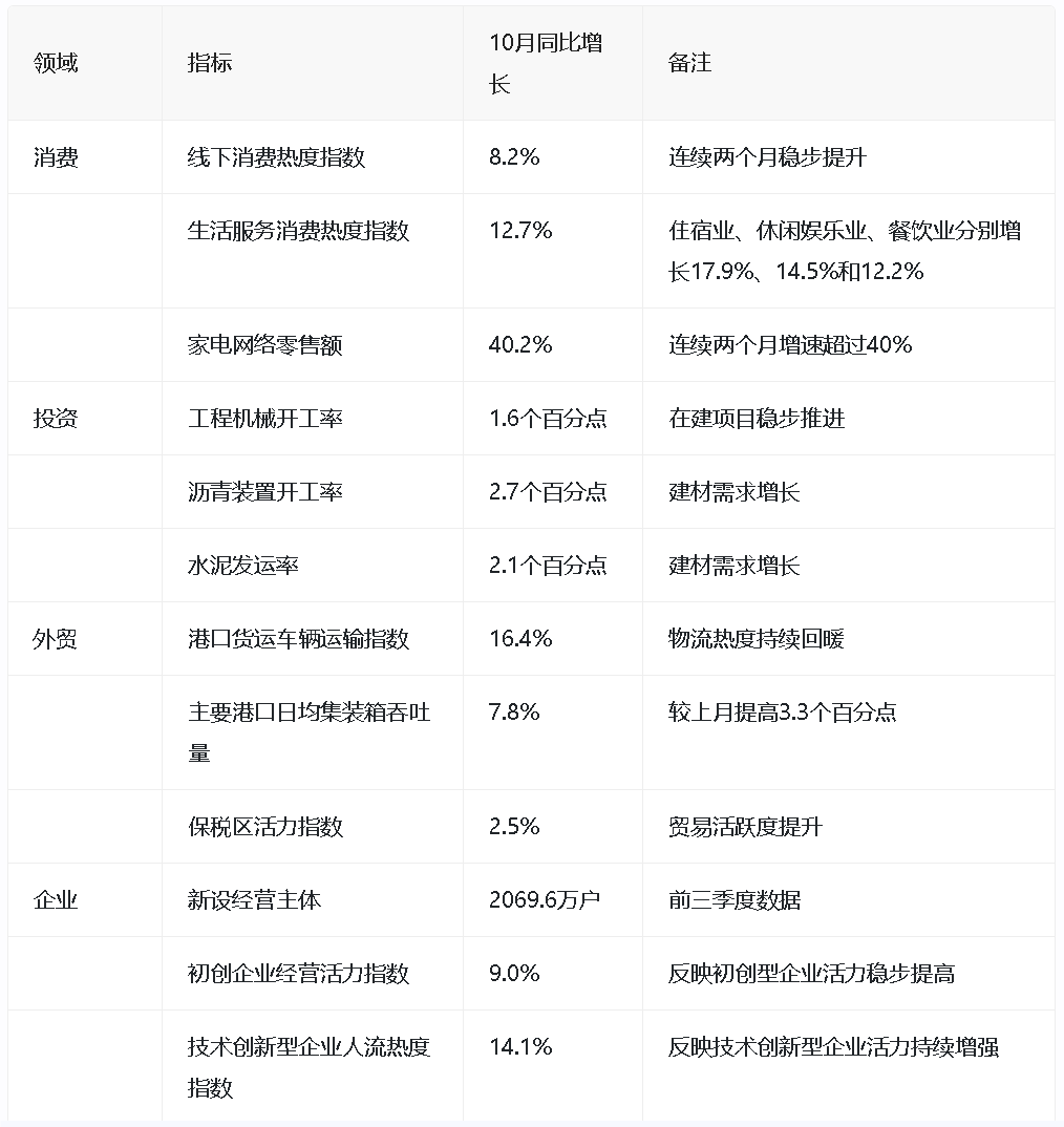 10月份,中国经济在消费、投资、外贸和企业经营等多个领域表现出显著的增长势头,映射出四季度经济回升的良好态势。具体来看,线上线下消费均实现回暖,家电消费增长尤为明显;投资方面,工程建设和建材需求持续增长;外贸领域,港口物流作业繁忙,出口新动能强劲;企业层面,创新创业数据活跃,经营主体活力提升。