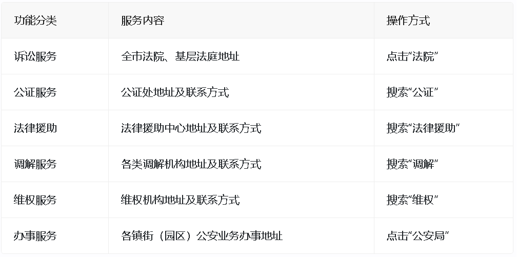 使用“东莞法治地图”非常简便。市民在进入“法治地图”页面后,可以通过点击下方的分类筛选,快速找到所需的服务。例如,点击“政法委”可以显示全市各中立法律服务社(站)的地址;点击“公安局”则显示各镇街(园区)公安业务办事地址;而点击“法院”则显示全市各法院、基层法庭的地址。