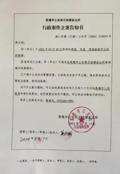 村民多次找派出所询问立案情况,被告知还在调查。7月22日,村民到派出所要求拿立案通知书,如不立案就要不予立案通知书,此时才拿到石牯塘派出所出具的一份:5月17日的《行政案件立案告知书》至今无处理结果。村民认为当地执法部门存在有案不立,立案不查的行为。