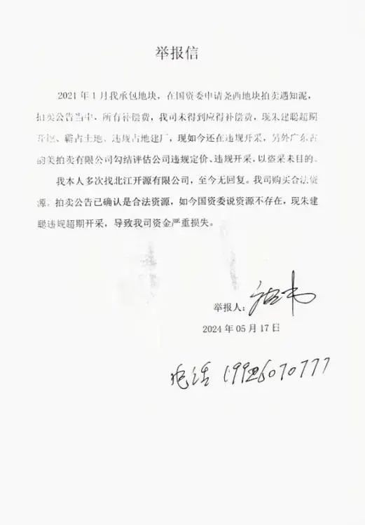 2024年6月20日,石牯塘委员张汉龙要求各位村长及京翰公司配合创兴公司开工,但对村民及京翰公司的补偿只字不提。并威胁调动防爆队或者警察来确保开工安全,村民及京翰公司认为镇政府个别领导明显不公正,有失公允。