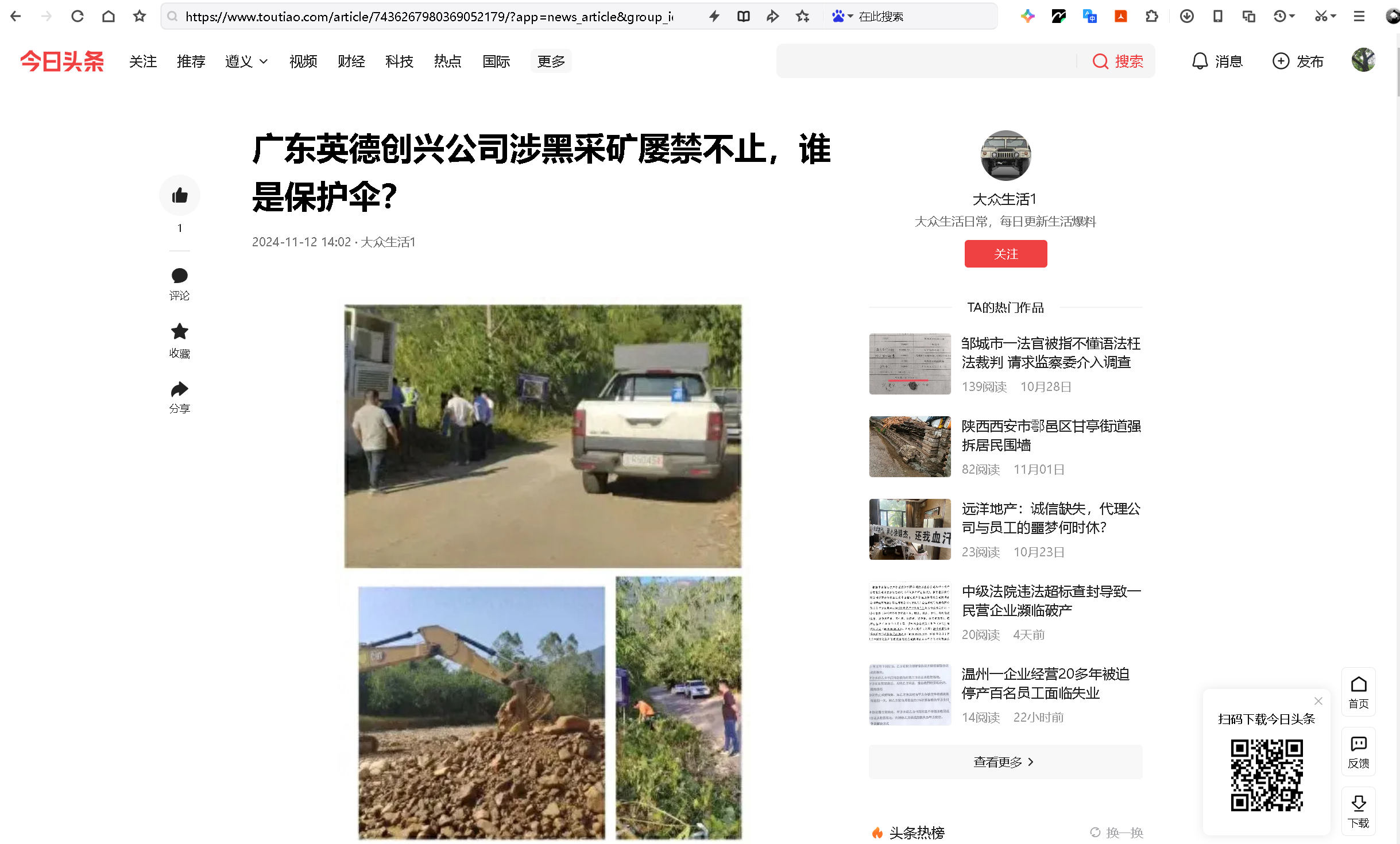 “英德市创兴公司打着清理弃渣旗号疯狂采矿”被媒体报道引起关注。近期接投诉反映:近几年,因创兴公司导致的受害方多次向有关部门投诉、报警后均以调解处理,村民、企业遭遇创兴公司胁迫强行开工,造成村民以及当地农业公司的巨大经济损失。此类问题在当地多次出现,涉黑问题却屡禁不止。