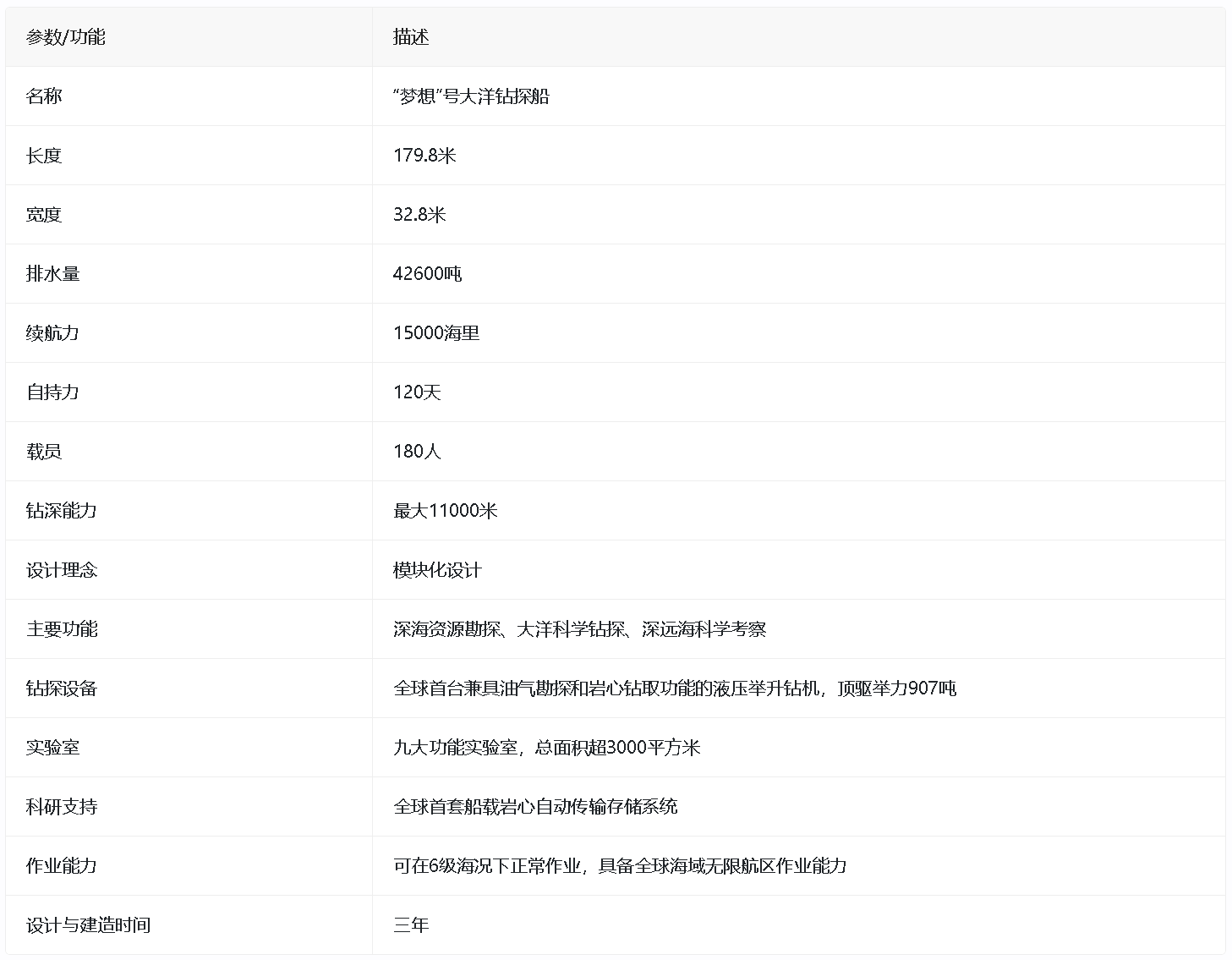 “梦想”号全长179.8米,宽32.8米,排水量42600吨,具备15000海里的续航力和120天的自持力,可载员180人。它的设计和建造汇聚了海洋、地质等多个领域最顶尖的科技成果,是一个极其复杂的巨系统。全国150余家参研参建单位用三年时间完成了建造任务,主要性能指标全面领先,充分证明了新型举国体制的强大优势。