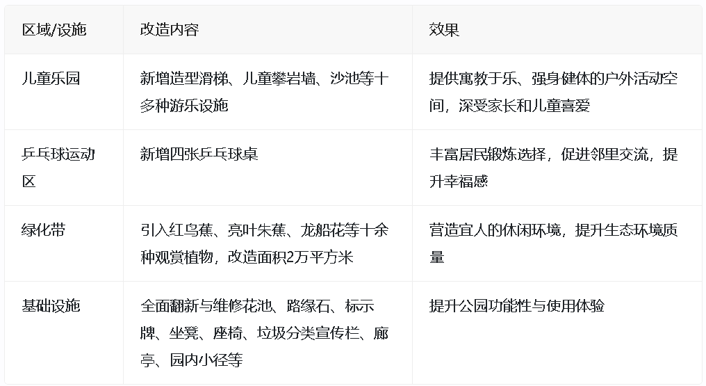 市民们对公园的改造给予了积极的反馈。刘女士表示,家住公园附近,每天带孩子来公园享受户外时光已成为日常,她对公园新设的儿童娱乐设施赞不绝口。王阿姨则提到,新增的乒乓球桌不仅丰富了居民的锻炼选择,还促进了邻里之间的交流与互动,大大提升了大家的幸福感。
