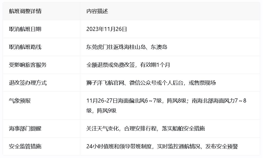 对于已购买11月26日狮子洋飞航船票的旅客,狮子洋飞航官网和微信公众号提供了全额退票或免费改签服务。旅客可在购票个人后台或前往狮子洋飞航售票现场办理相关手续,有效期为一个月。