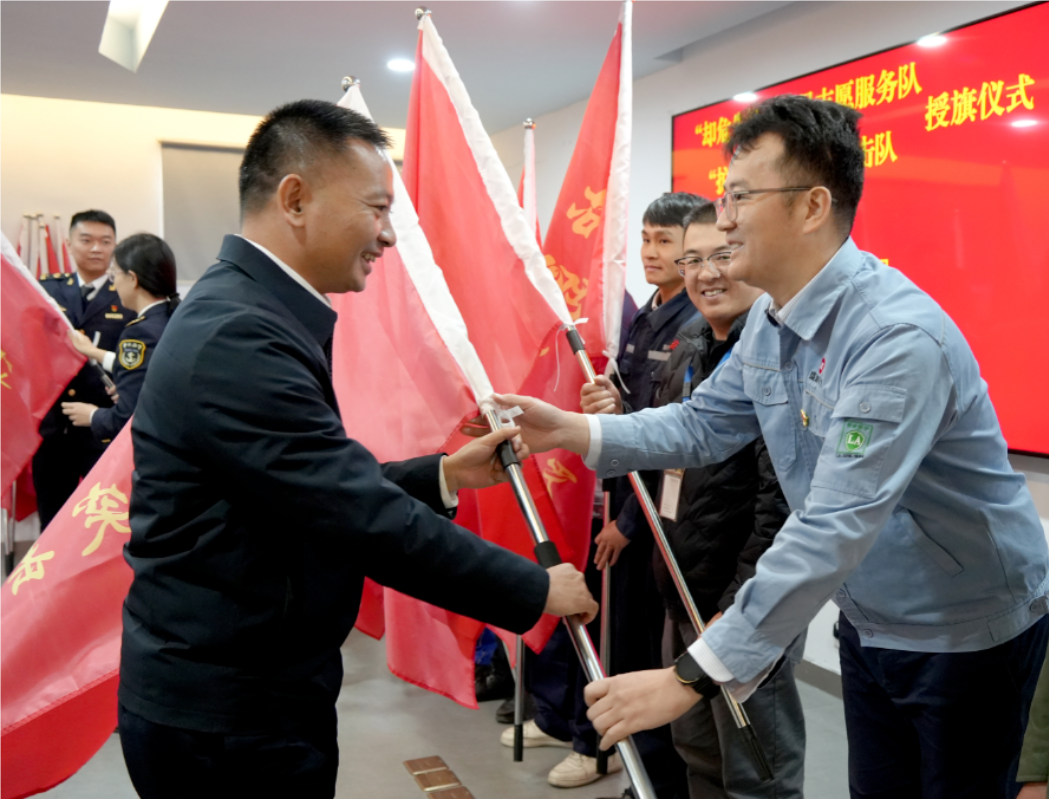 在活动中,“却危先锋”党员志愿服务队和“护岛尖兵”青年突击队接受了授旗仪式,邹代胜和刘永定分别为两支队伍授旗。这一仪式激励党员青年代表在安全生产工作中发挥带头作用,彰显了党组织在应急管理和安全监管中的先锋作用。